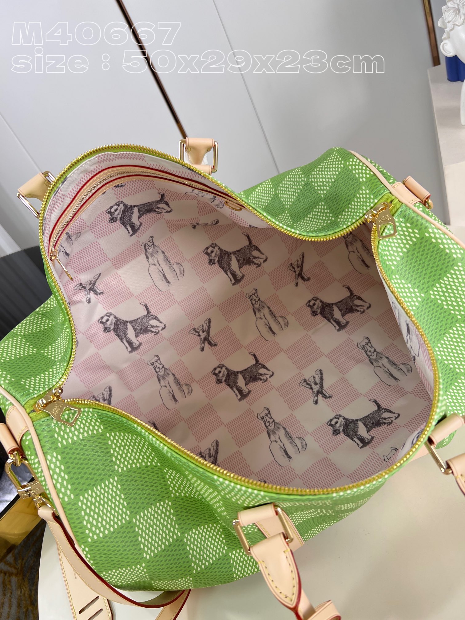 [Exclusive real shot of M40667 green grid] The new Damier Golf coated canvas is classic and bold, and its golf-links color scheme brings a gorgeous appearance to the keep all bandou lier 50. Cowhide side straps and top handles highlight the bag’s unique look and are decorated with a pink Louis Vuitton flower pattern. Removable leather shoulder straps adjust for a comfortable shoulder and back feel. size:50x29x23cm