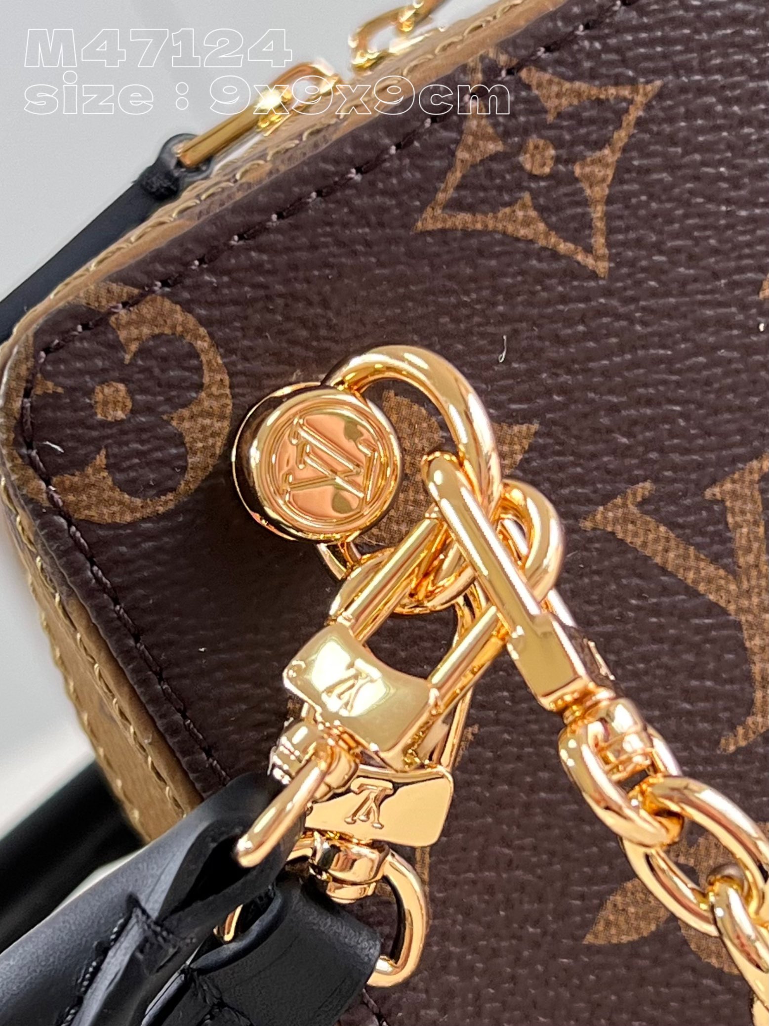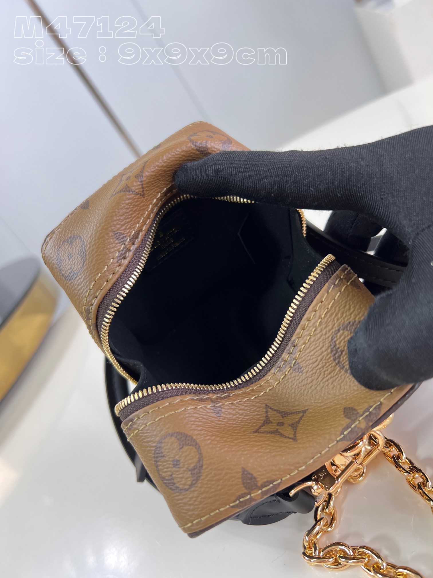 [Exclusive real shot of M47124] Dice handbag is made of Monogram canvas to create a pocket shape, exploring multiple functions in a flexible manner. Leather handles, adjustable leather shoulder straps and eye-catching chains are all detachable, and double zippers allow for convenient storage, making it an excellent choice for collection. 9.5 x 9.5 x 9.5 cm (length x height x width)