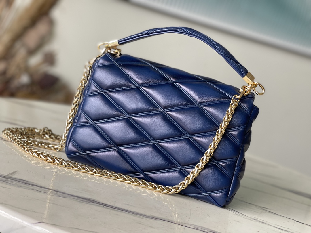 This GO-14 medium handbag is made of gorgeous sheep leather and uses quilted patterns to pay tribute to the brand’s traditional luggage design. The LV Twist Lock provides eye-catching style, and the top handle can be held individually or transformed into leather shoulder pads with sliding chain straps for a comfortable shoulder back or cross-body experience.