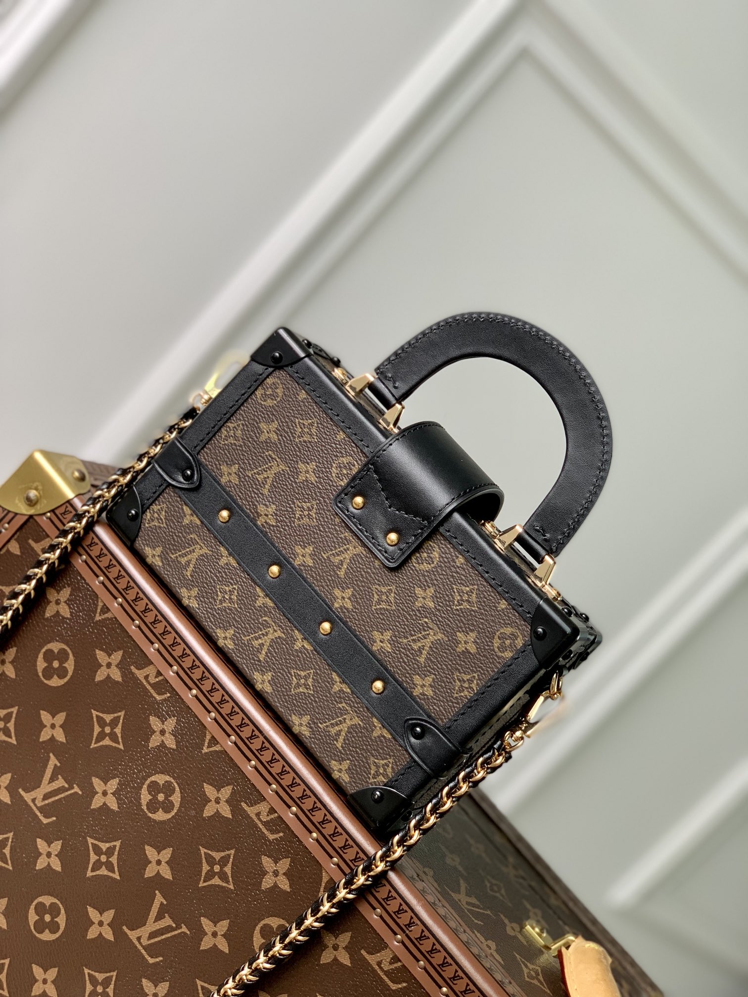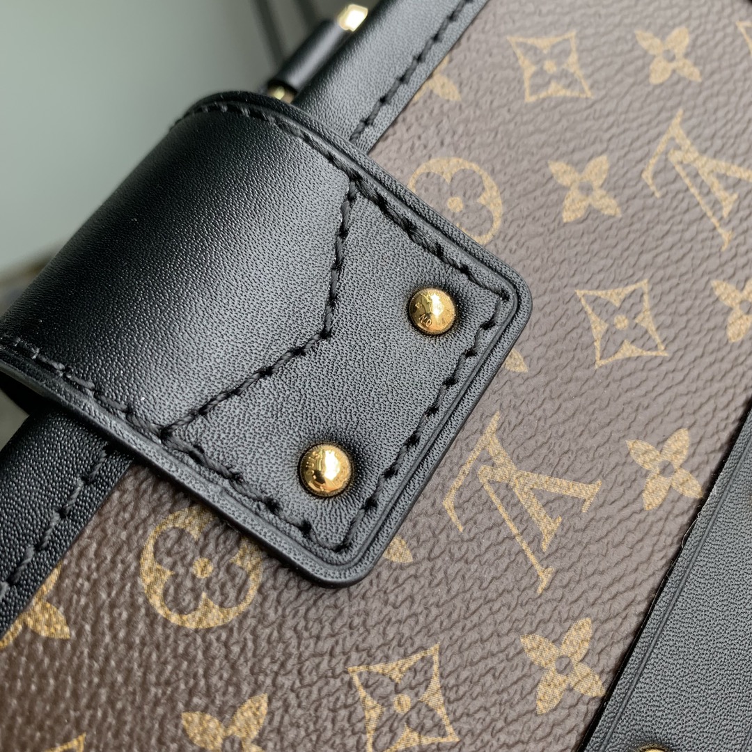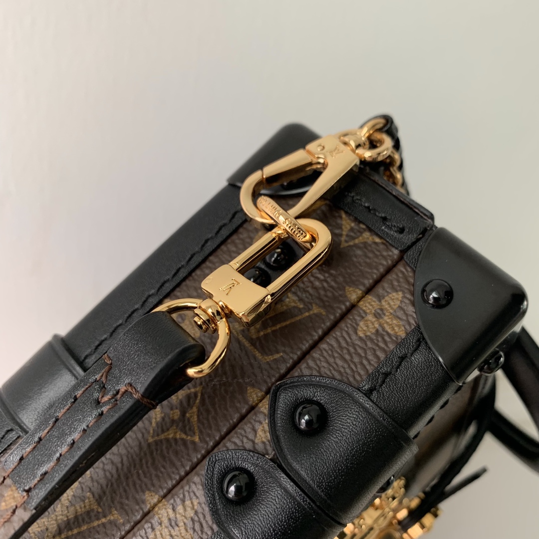 Nicolas Ghesquière adds a new top handle to the Petite Malle Capitale handbag, slowly revealing the retro look. Monogram canvas and calm trim shape the hard case configuration, paired with dazzling S-lock latches, studs and rivets, continuing the urban trend of the past. Detachable woven chain adds a soft touch. 20.0 x 12.5 x 6.0 cm (L x H x W)