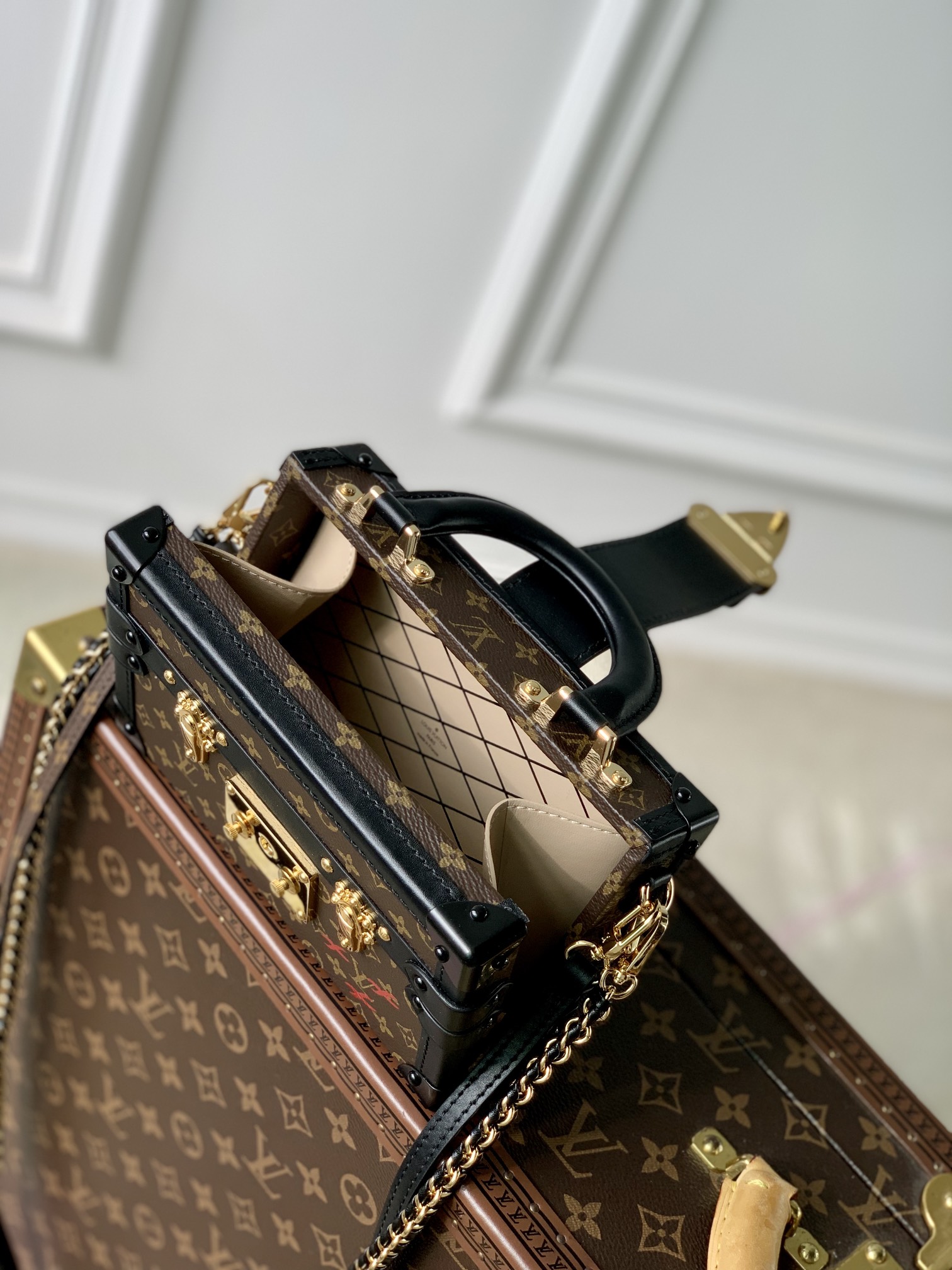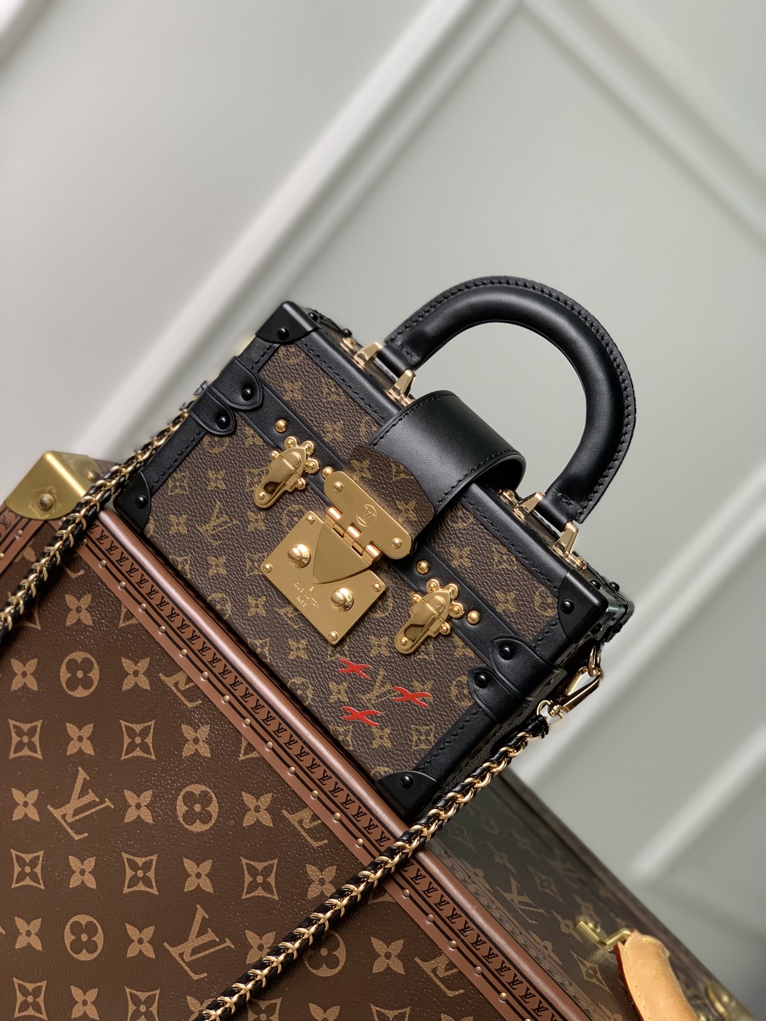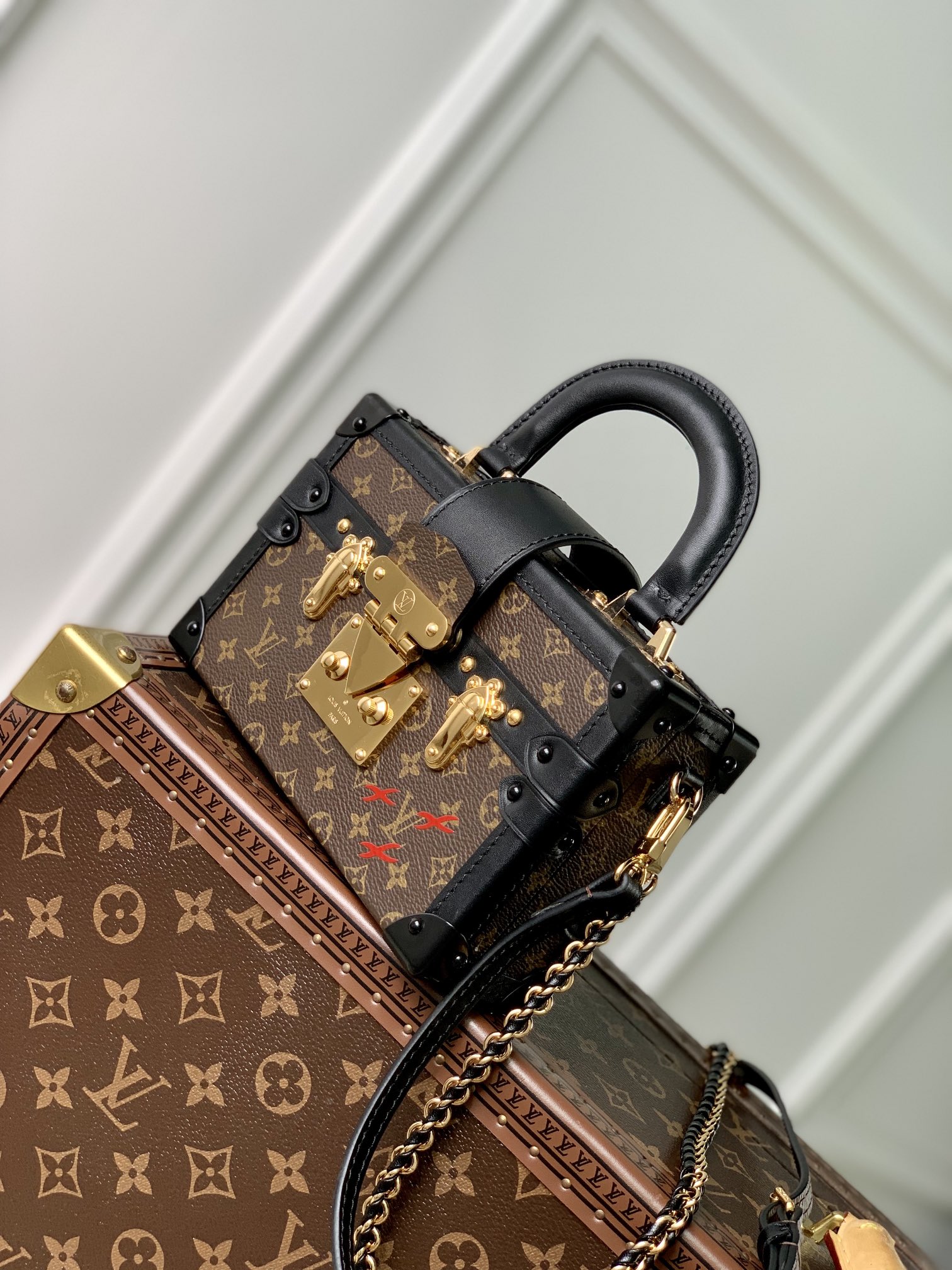 Nicolas Ghesquière adds a new top handle to the Petite Malle Capitale handbag, slowly revealing the retro look. Monogram canvas and calm trim shape the hard case configuration, paired with dazzling S-lock latches, studs and rivets, continuing the urban trend of the past. Detachable woven chain adds a soft touch. 20.0 x 12.5 x 6.0 cm (L x H x W)
